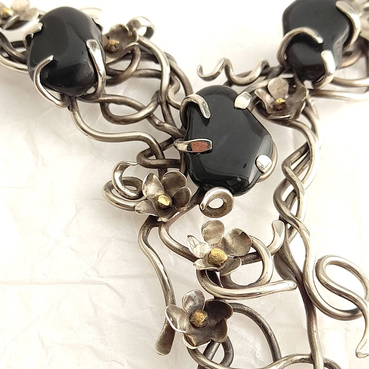 Realizado en alpaca, con detalles en bronce y las piedras son onix negro.