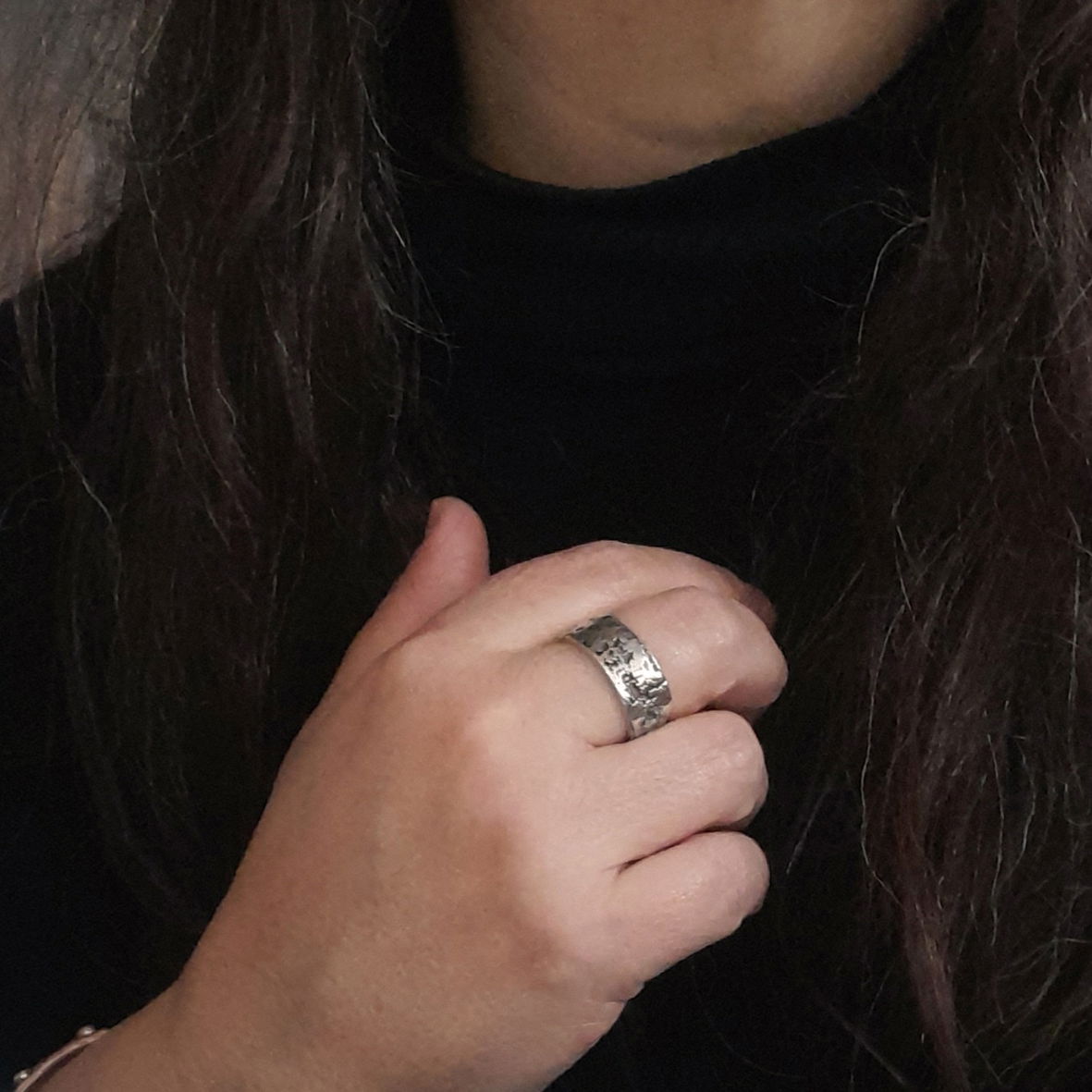 Tené en cuenta que los anillos anchos como este, se usan una medida más grande. Porque al ser anchos quedan más cómodos si son más grandes... Así que, mi consejo es que midas un anillo ancho para saber cual es tu número. Si no encontrás tu medida en las opciones (última foto), podes comunicarte conmigo por WhatsApp o mail y te ayudo a saber cual es tu número!