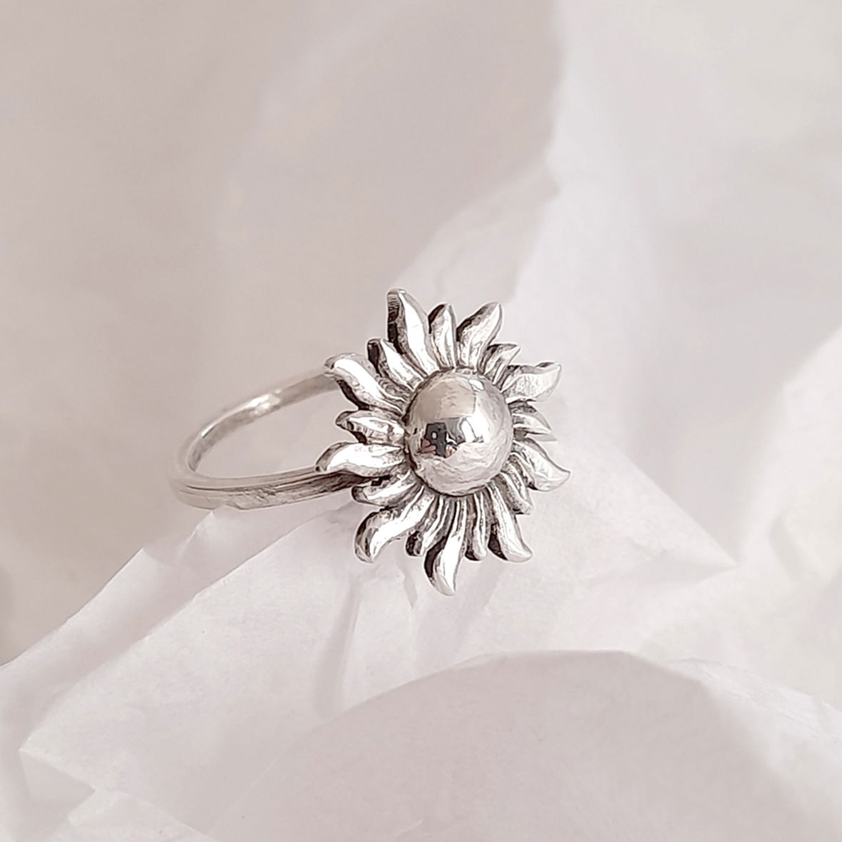 Espiritualmente, el sol representa la conciencia, el despertar interior, la claridad mental y la expansión. Este anillo es un arquetipo del poder creativo, de la calidez del corazón y del fuego que impulsa la acción. En muchas culturas, es símbolo del alma, del yo esencial que se manifiesta con autenticidad.